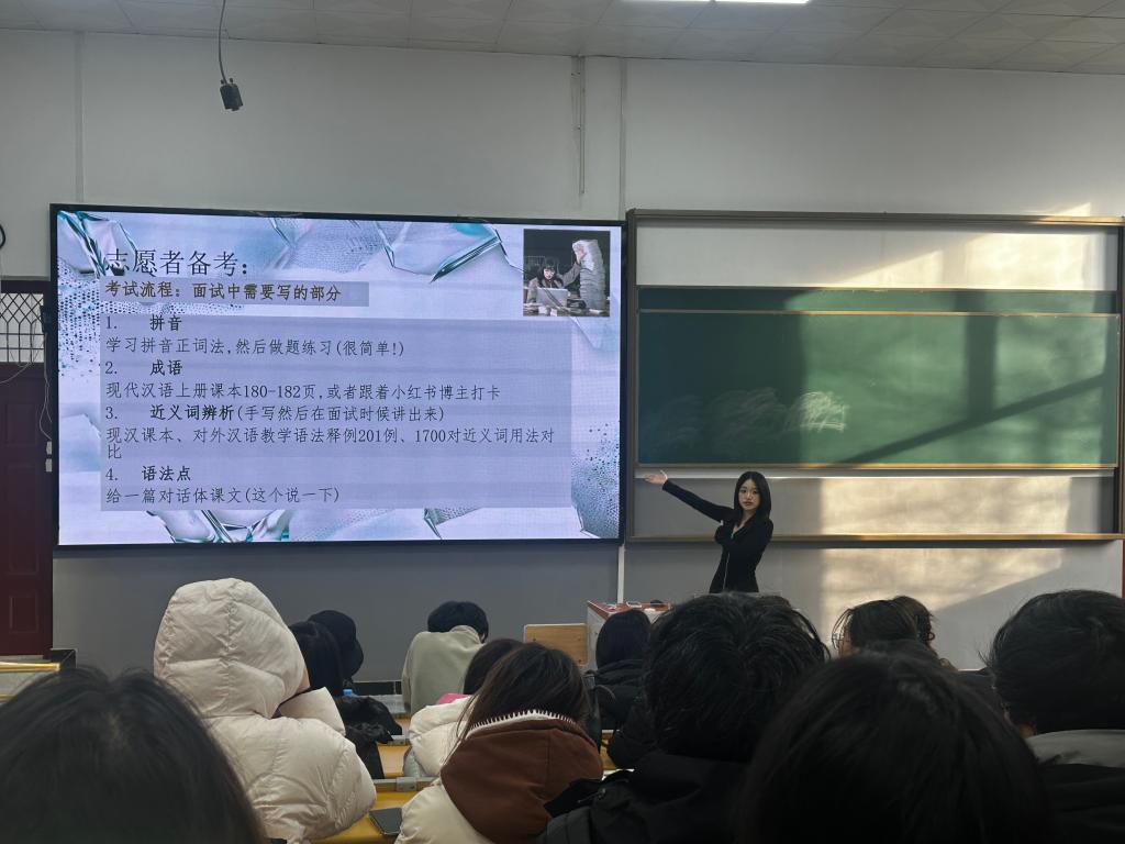 近日,文学院2022级两位同学成功考取国际中文教育志愿者,即将奔赴国际中文教育一线,肩负起传播中华文化、促进中外语言文化交流的使命。为帮助汉语国际教育专业学子明确备考方向、提升面试竞争力,12月22日,文学院特意邀请马仲旺、老茹莉两位同学开展国际中文教育志愿者备考与面试经验分享会,汉语国际教育专业师生代表参与此次活动。