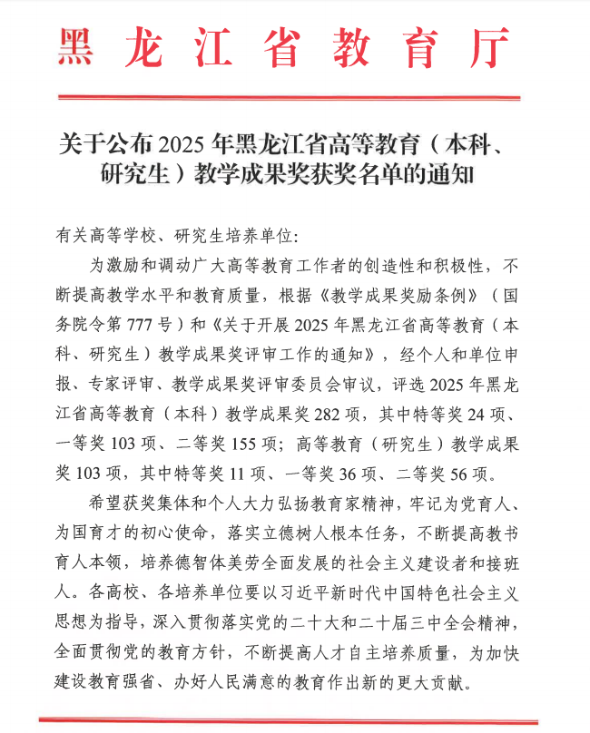 近日,2025年黑龙江省高等教育教学成果奖评选结果正式揭晓,我院赵丽院长牵头团队申报的教学成果《五基贯通・四阶递进:地方高校汉语言文学类专业实践教学体系构建与实践》喜获二等奖。这一荣誉实现了我院在省级教学成果奖上零的突破,既是对学院二十年来深耕教学改革、潜心育人工作的高度认可,更是我院教育教学事业发展历程中的具有标志性意义的重要里程碑。充分彰显了我院在人才培养、教学创新领域的核心实力与领先水平。