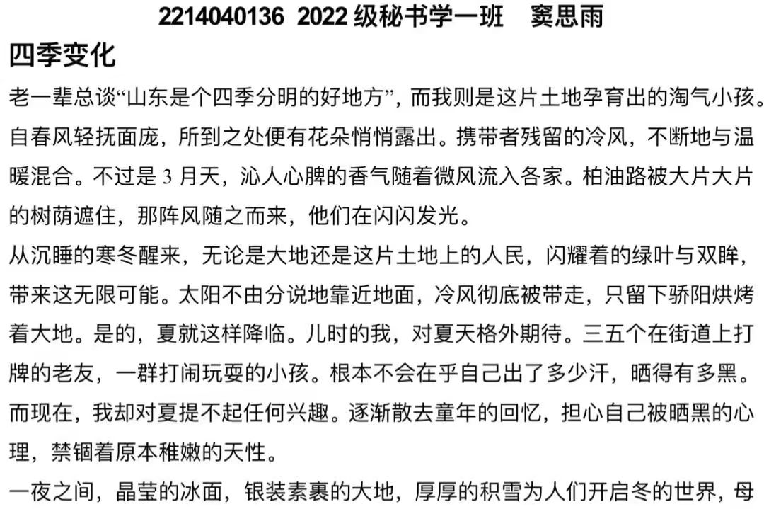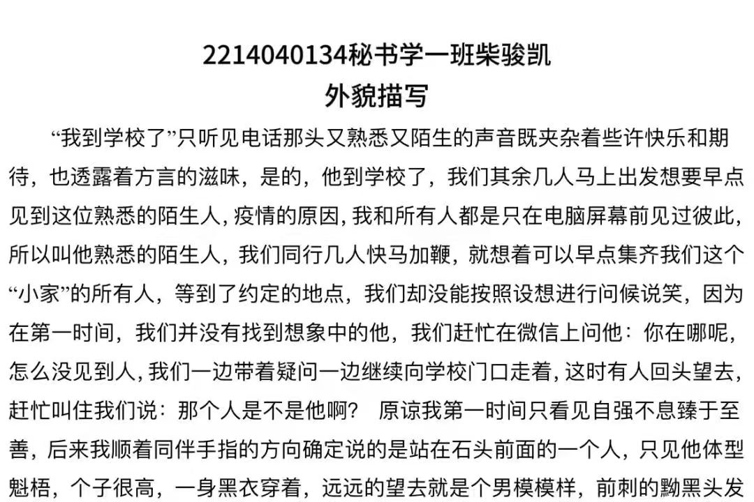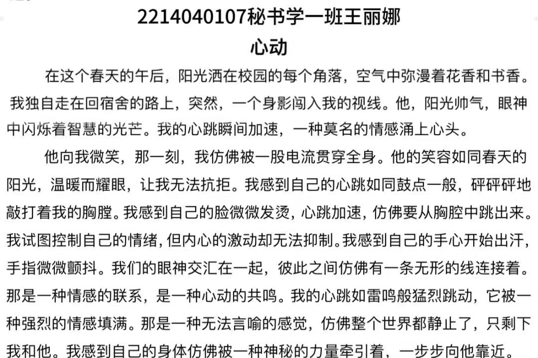 在文学院这片文学的热土上,由文章写作技能训练刘月彤老师组织策划了一场文学盛宴——“记录美好 感悟深刻 品味生活”系列主题片段写作训练。这是一场用文字触摸心灵、用情感品味人生的旅程,每一位同学都化身为文字的舞者,舞动笔尖,探寻写作的奥秘。