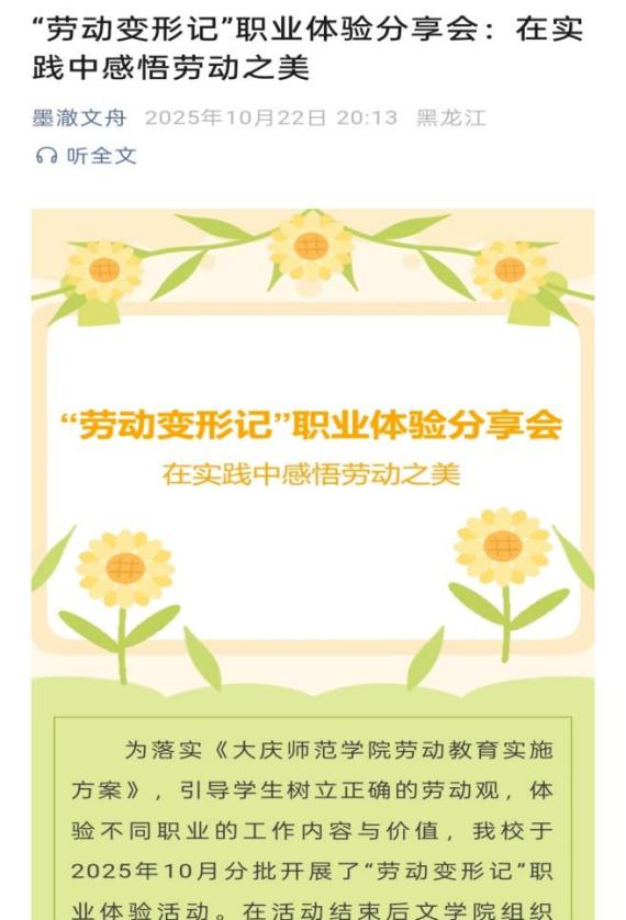10月“劳动变形记”职业体验,文学院结合学生专业特长与成长需求,筛选辅导员助理、校园保洁员等适配岗位,组织学生自主报名参与。学生在对应岗位沉浸式参与日常工作,熟悉岗位流程与技能要求。活动结束后,文学院组织分享会,搭建学生分享平台,打破职业认知壁垒。