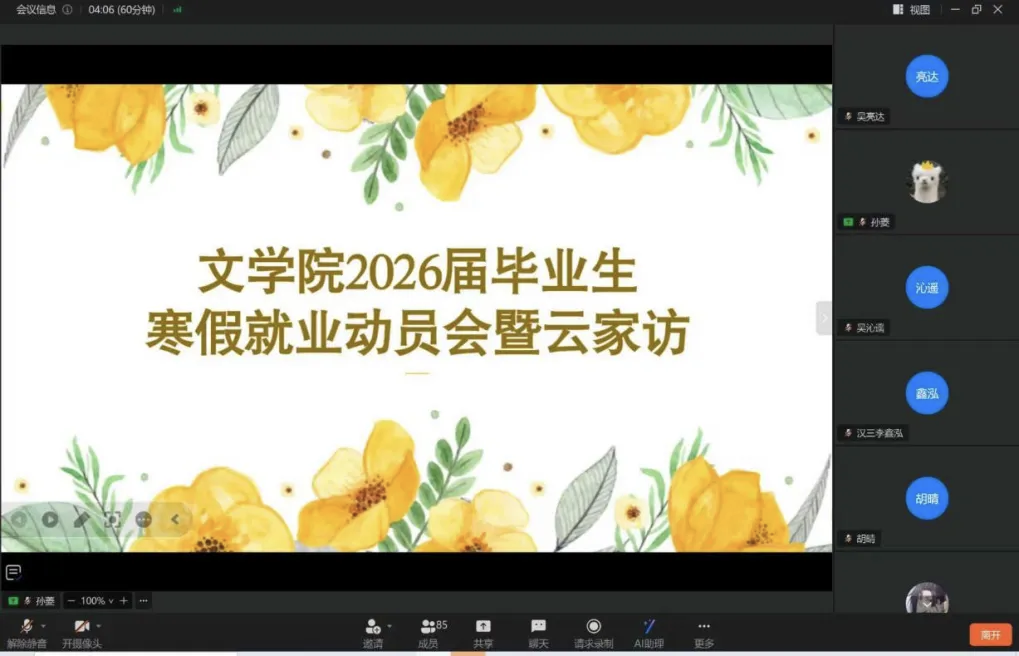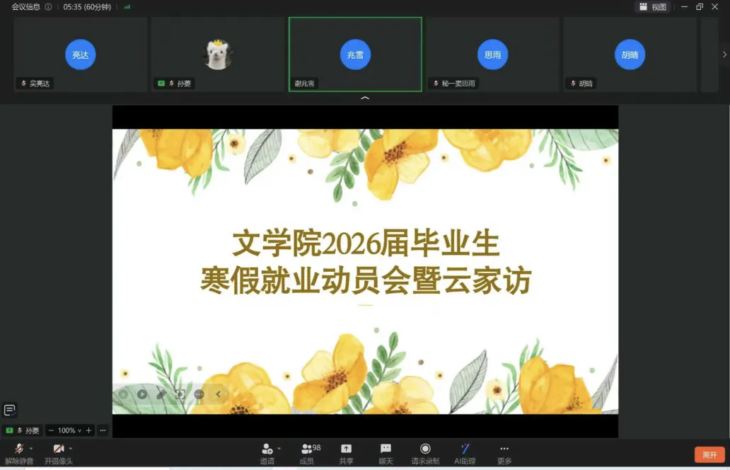 为引导毕业生主动把握就业机遇,抢抓寒假这一春招预热、职业规划的黄金期,1月14日,文学院线上召开2026届毕业生寒假就业动员会暨云家访。会议由辅导员谢兆雪主持,2022级全体同学及家长共同参与。