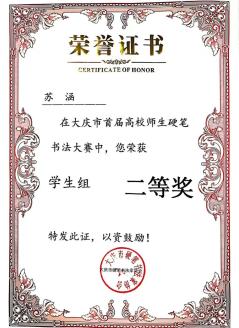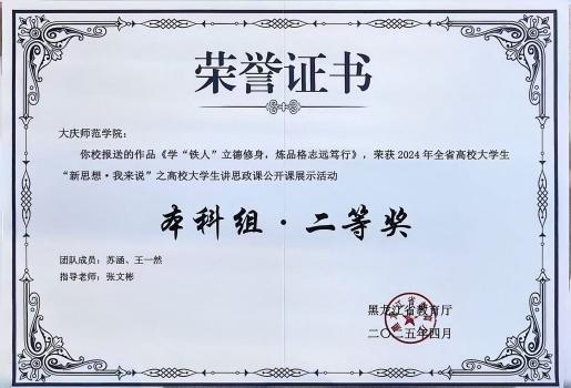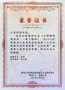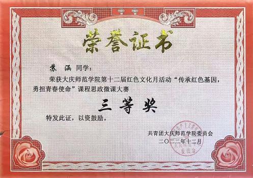 她始终以赤诚之心拥抱信仰,把理论学习化作日常习惯,用扎实的思想根基筑牢成长底色,思想政治理论课平均 95 分,是她坚守理想的最好答卷。她以文传情、以笔抒怀,主动传承红色基因、弘扬铁人精神。在校红色文化月微课大赛获三等奖,“全城共读《铁人故事》” 活动获校级一等奖;书法作品《厚植家国情怀》获省大学生艺术展演三等奖,主讲思政微课获全省二等奖。在各类红色实践中,她不断坚定信念、凝聚力量,让青春始终向阳而行。