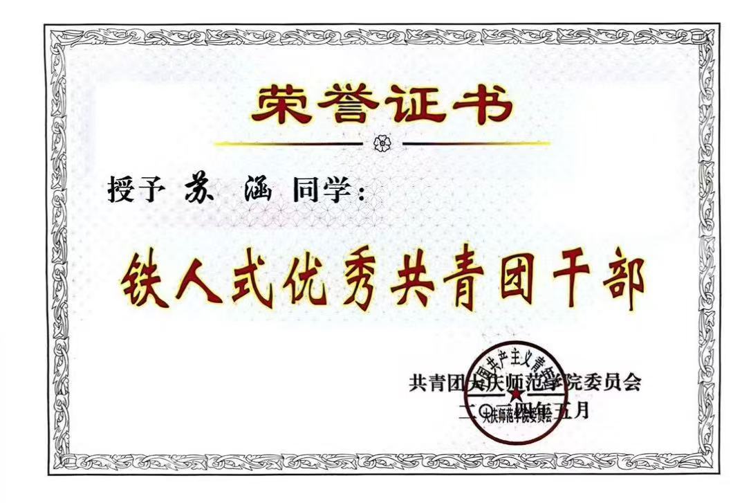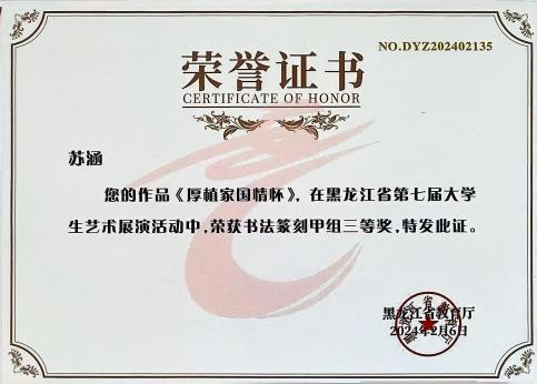 苏涵,大庆师范学院文学院汉语国际教育(师范类)专业2022级本科生,汉族,中共预备党员,现任班级团支书。曾获国家奖学金、校级一等奖学金、校级二等奖学金;校“铁人式优秀共青团干部”“优秀共青团员”“优秀学生干部”“三好学生”“青马工程优秀学员”等荣誉称号。在学科竞赛领域成果丰硕,曾获黑龙江省“新思想·我来说”大学生讲思政公开课活动二等奖、黑龙江省第七届大学生艺术展演书法篆刻甲组三等奖、第七届中华经典诵写讲大赛“笔墨中国”汉字书写大赛优秀奖、2025年全国语文规范化知识大赛大学生组二等奖、中文联盟“语言桥杯”国际中文数智化教学技能交流展示活动优秀奖等。积极投身社会实践,圆满完成在让胡路区奋斗街道为期一年的基层团建指导工作;组织留学生中华优秀传统文化体验活动3次,并在实习中负责部分零基础留学生的汉语针对性教学工作。