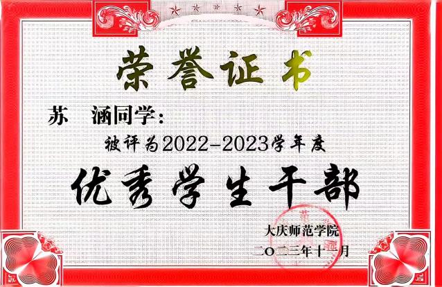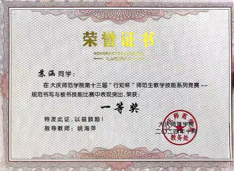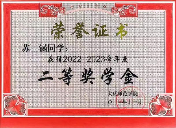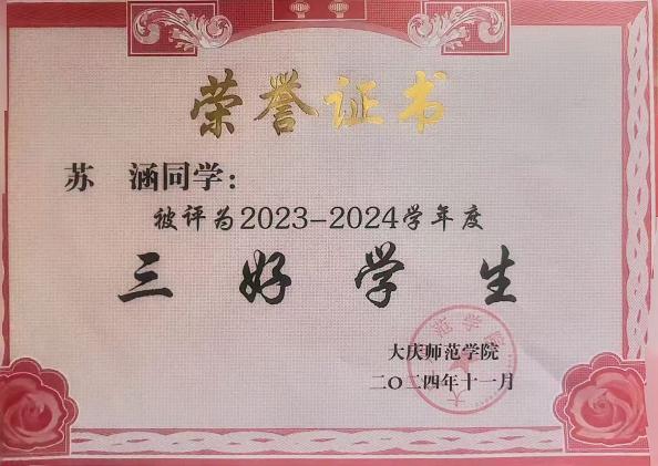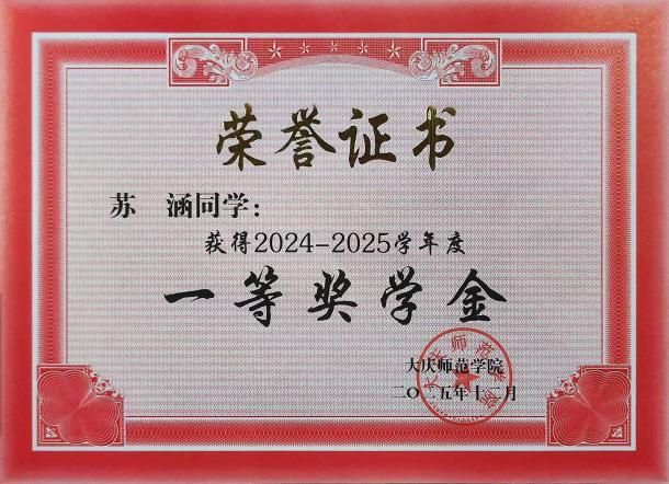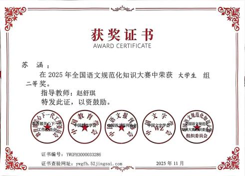 苏涵始终把学习放在首位,以勤奋为梯、以专注为翼,在专业道路上稳步前行。她学习态度严谨、精益求精,专业成绩与综合测评连续两学期位列年级第一,斩获国家奖学金、校级奖学金等多项荣誉。她不满足于课堂知识,主动参与全国语文规范化知识大赛、“笔墨中国” 书写大赛、“语言桥杯” 教学技能交流等赛事并屡获佳绩,在备赛与实践中夯实教学功底,坚定成为优秀教师的初心,成长为有学识、有温度的新时代青年。
