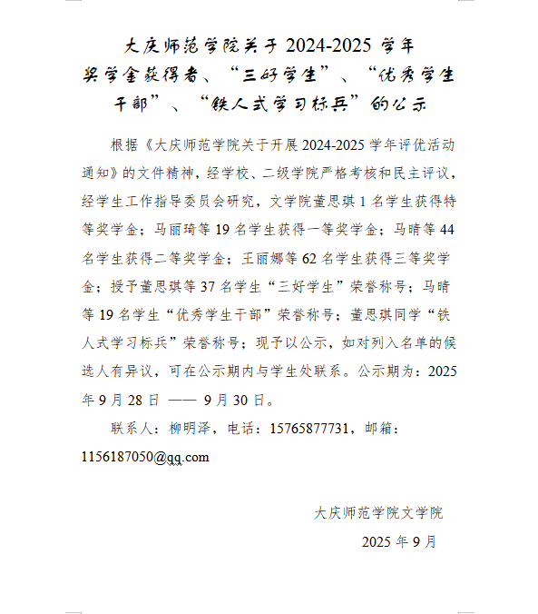关于文学院2024-2025学年奖学金推荐名单、2024-2025学年三好学生推荐名单、2024-2025学年优秀干部推荐名单、2024—2025学年度“铁人式学习标兵”推荐名单公示