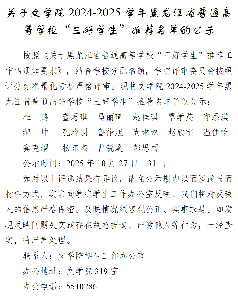 上一条:关于文学院2025年度家庭经济困难学生学费减免工作结果公示 下一条:关于文学院2024-2025学年奖学金推荐名单、2024-2025学年三好学生推荐名单、2024-2025学年优秀干部推荐名单、2024—2025学年度“铁人式学习标兵”推荐名单公示