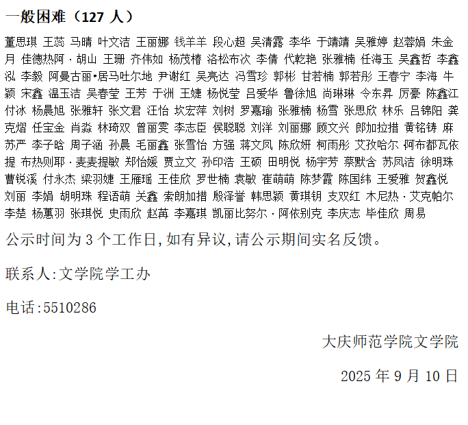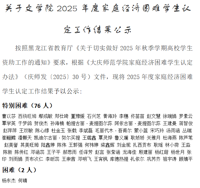 关于文学院2025年度家庭经济困难学生认定工作结果公示